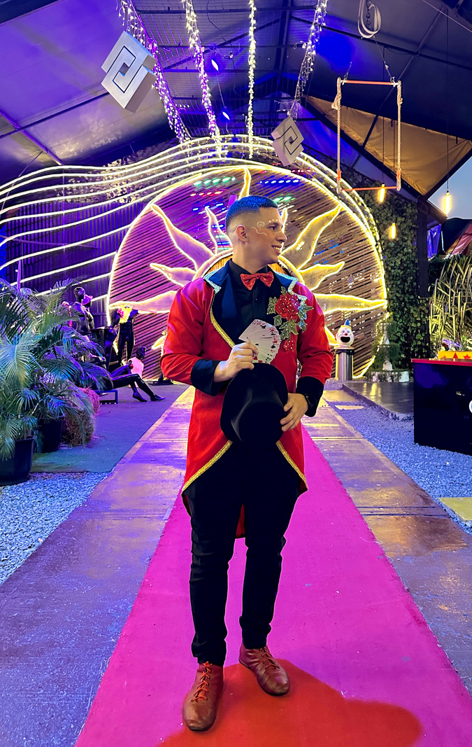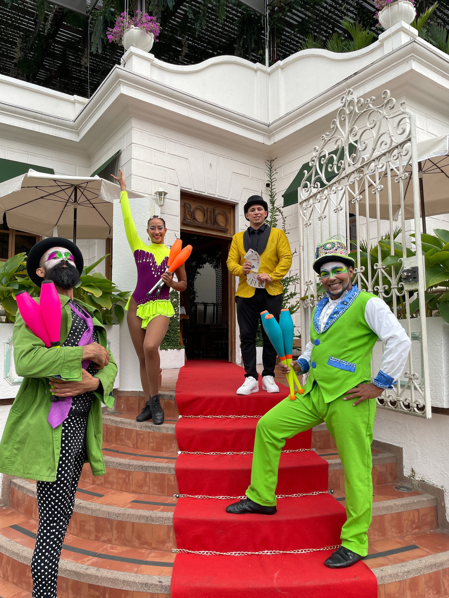 Nuestros personajes darán una emocionante y divertida bienvenida a tus invitados donde se podrán tomar fotos con los artistas. Prepárense para ser testigos de una fusión única de magia y circo, presentada por nuestro carismático mago anfitrión. Él guiará al público a través de un mundo de asombrosos actos circenses y sorprendentes ilusiones, creando momentos mágicos que dejarán a todos boquiabiertos !"🎪✨🎩